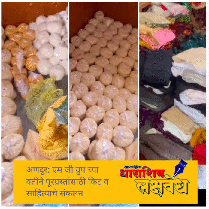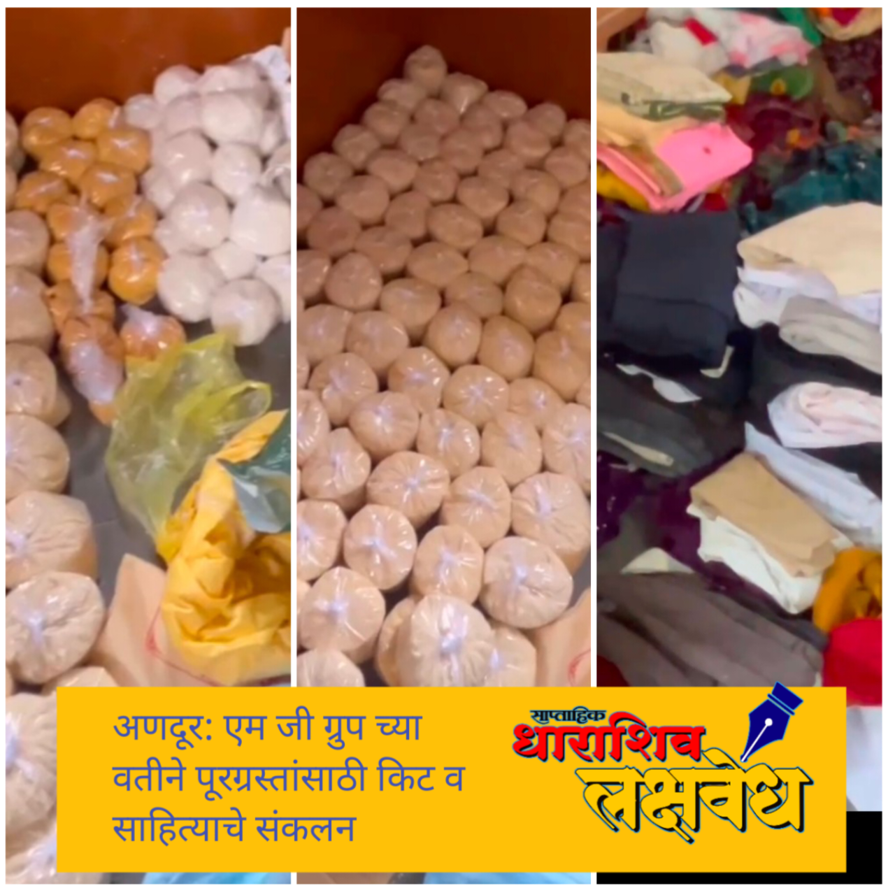तुळजापूर तालुक्यातील अणदूरच्या एम जी ग्रुपच्या वतीने पूरग्रस्त भागासाठी नागरिकांसाठी विविध माध्यमातून साहित्य व कीटचे संकलन सध्या करण्यात येत आहे.मंडळाच्या माध्यमातून जवळपास ५० ते ६० किट तयार करण्यात आले असून ४०० ते ५०० साड्या व इतर लागणारे साहित्य मंडळाचे कार्यकर्त्यांनी स्वतःच्या घरातील एकत्रितपणे जमा केले आहे.