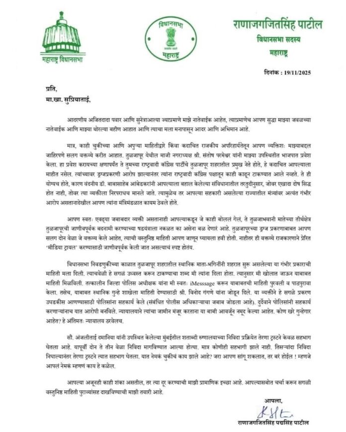 खासदार सुप्रियाताई सुळे यांना आमदार राणाजगजीतसिंह पाटील यांचे तुळजापूर ड्रग्ज प्रकरणी खळबळ जनक पत्र